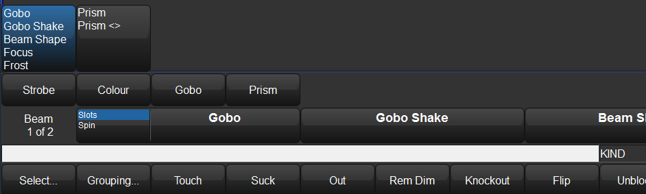 2. Press any “Kind” key (INTENSITY, POSITION, COLOUR, BEAM) to locate your desired attributes. Some parameters may require you to press the same Kind key multiple times in order to access the attribute due to the amount of parameters. 3. Spin the wheel until you achieve the desired value.