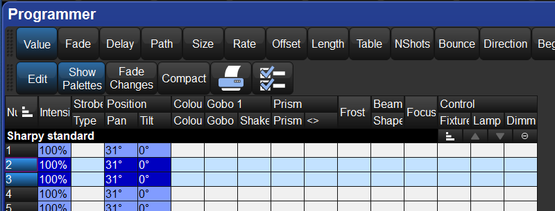 In the Programmer, the Active Fixture Selection will be what is modified when you edit. The Active FIxture Selection are the fixtures listed in dark blue in the Programmer. Not all fixtures in the Programmer need to be Actively Selected at any time. However, if you do wish to quickly select all fixtures currently in the Programmer and make them the Active Selection, you can: