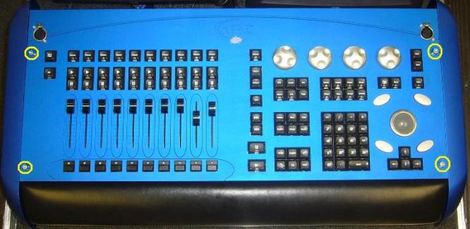 Note: Some iPCs contain a SATA HDD while others contain an IDE HDD. Be sure to replace with the correct model of hard drive.[/vc_column_text][/vc_column][/vc_row][vc_row][vc_column width=”1/1″][vc_text_separator title=”Opening the Console” title_align=”separator_align_left” color=”blue” style=”double”][/vc_column][/vc_row][vc_row][vc_column width=”1/1″][vc_column_text]1. Use a 4mm hex key to remove the 4 silver screws holding the front panel in place (encoder wheels and fader caps need not be removed).